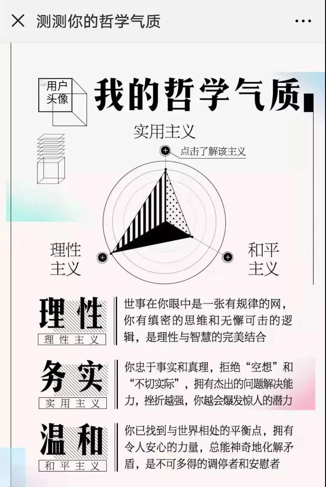 感谢网易新闻,感谢单位的免费WIFI,让小编在昨天的世界哲学日里利用工作间的休息时间,做了一个“我的哲学气质”测试。