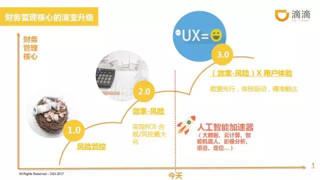 第三阶段是什么呢?也是现阶段,3.0时代。我们在座的每个人都在用微信,张小龙说一切以客户价值为依规。滴滴作为一个企业,我们把用户体验当成最重要的一件事情,产品每天都在迭代,我们需要听乘客的声音,听司机的声音。财务管理也是这样,财务过往很少关注体验,然而在3.0时代,这个体验甚至是乘法,是效率减去风险乘以用户体验。为什么是乘法呢?以前跟很多人交流的时候,他们会跟我说,为什么财务在企业里面地位不高?为什么业务不愿意带着我们反而自己玩?业务经常对财务说你给我报销一下吧,觉得财务就是报销;或者说帮我算算这个账吧,去对接一下银行吧,总之把财务放的比较低,觉得跟业务的经营行为是没有关系的。其实最大的一点就是用户的体验。对财务来说,我们的用户很多时候就是内部,包括内部的员工,包括内部的管理层。那怎么样和他们建立良好的信任关系?我们经常说的一句话就是融入业务,成为他自己的人,当他有事的时候,我们财务能成为业务的左膀右臂。