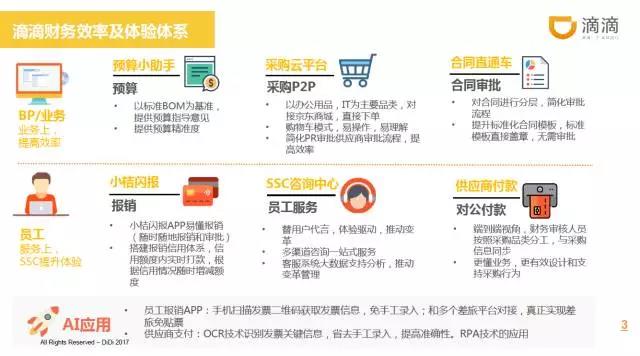 关于员工体验的,滴滴的SSC咨询中心不仅是一个能够集中式的管理知识平台,更多能提高员工的体验的平台。比如现在我们员工的报销,48小时就能到账。我们现在在两个法人里面推广了信用卡的机制,当时你一提交申请,马上就到账了,但是后面有信用卡积分,你不断积累好的话,信用分会不断涨,开始我们给员工五千的额度,未来你的信用额度好的话,会给你增加额度。