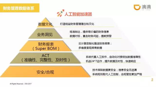 各位尊敬的来宾,非常荣幸能够作为代表,分享一下人工智能时代的财务变革。我来自滴滴出行,很多人说人工智能在互联网的时代应用是最广的,滴滴出行是应用最多的,体现在财务方面,就是我们在不断地进行着跨界思维。