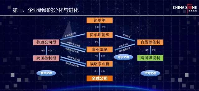 一个企业从小公司开始,不断形成某种架构。从简单型到简单职能型,再到直线职能型,然后再形成事业部制,进而形成战略型事业群,这是典型的海尔机制,也是家电行业的标杆模型。它发展下来,又形成了网络化或者是创客平台。而华为不是按照事业部制的方式运行的,它所形成的是一种集权模式,并向跨国职能型发展。它是严格的控制与在某些领域的聚焦。联想则在向控股和跨国控股的方向发展。这三条道路会不会殊途同归呢?这会涉及到一些技术发展,但最终的目标都是走向全球化的——这些是企业分化与进化的过程。
