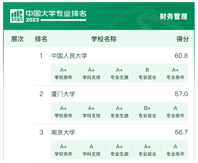 2023年6月15日,高等教育专业评价机构软科正式发布“2023软科中国大学专业排名”。在本次中国大学专业排名中,中国人民大学商学院共获评5个A+专业,其中会计学、财务管理、市场营销、贸易经济、工商管理专业排名全国第一。